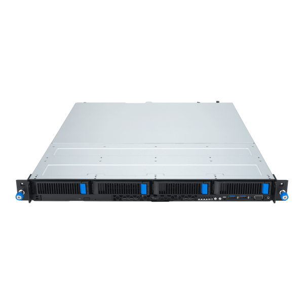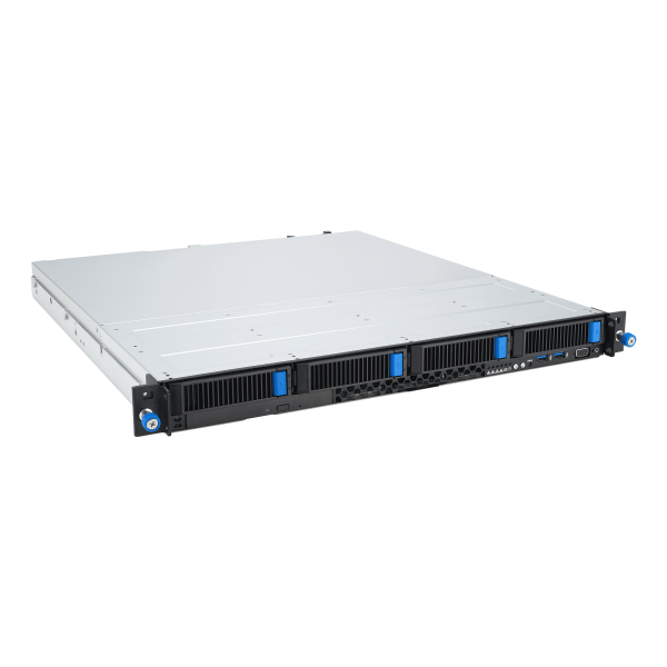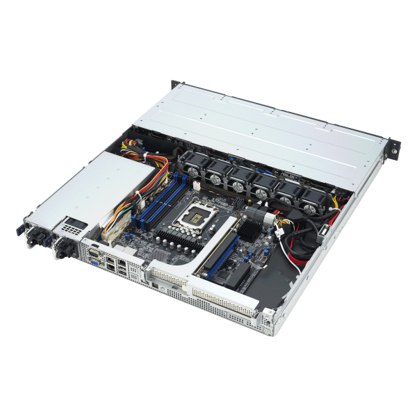 ASUS RS300-E12-RS4 in an Intel® Xeon® E-2400 and Intel®Xeon®6300 1U server with support for four DDR5 ECC UDIMM, four NVMe, one M.2, one PCIe® 5.0 slot and one PCIe 4.0 slot, plus dual LAN, 80 PLUS® Platinum redundant power supplies, Intel Platform Firmware Resilience (PFR), onboard ASUS ASMB11-iKVM and chassis-intrusion alert.