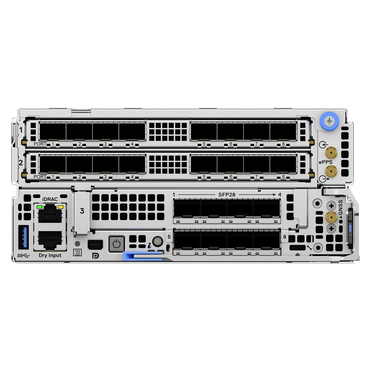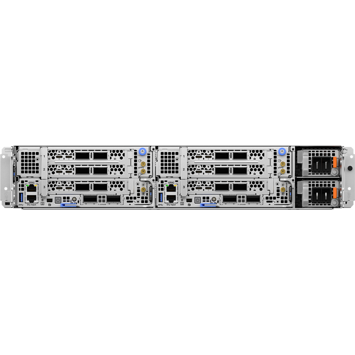 | Ports | OCP Network Options Network optimized configuration: Up to two DSFF OCP NIC card 3.0: (8 x SFP 10/25 GbE ports per card) optional Embedded NIC Flexible configuration: 2 x QSFP 100 GbE ports Network optimized configuration: 8 x SFP 10/25 GbE ports Front Ports 1 x RJ45 Dedicated iDRAC Direct 1 x RJ45 dry port 1 x USB – A 3.0 compliant port 2 x SMA for ePPS input/output 1 x SMA for GNSS antenna (optional) 1 x UCB-C for system management 1 x Mini-DisplayPort |