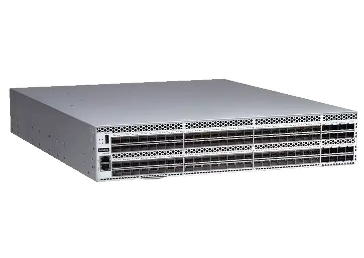 | Fibre Channel ports | ​128 ports (96 64G SFP+ ports, plus 16 2x64G SFP-DD ports), each supporting E_Ports, F_Ports, M_Ports, D_Ports, and EX_Ports ​48-port base configuration; additional ports are enabled with two 24-port SFP+ PODs (Ports on Demand), plus a 32-port SFP-DD POD (16 2x64G SFP-DD transceivers), scaling the switch from 48 ports to 128 ports. |