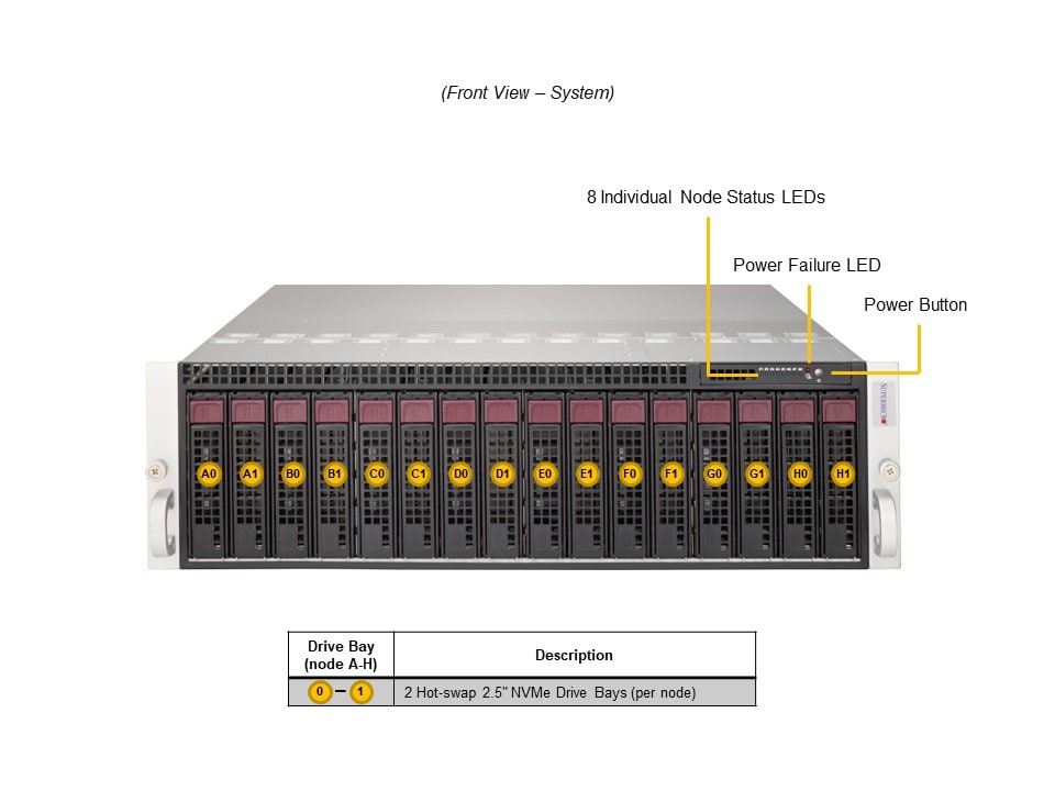 - Default: Total 2 bays2 front fixed 3.5″/2.5″ NVMe/SAS*/SATA* drive bays