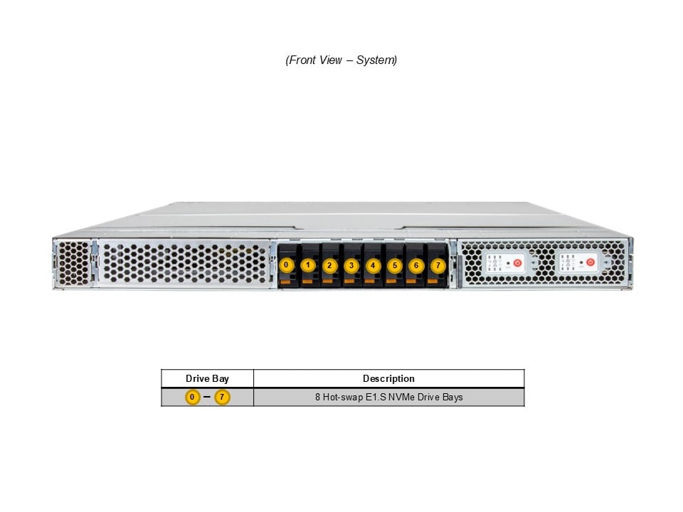 - Two nodes in a 1U Form Factor. This system currently supports up to eight E1.S drives with NVIDIA’s BlueField®-3 in Storage Configuration Mode. Please consult with your Supermicro Salesperson for details