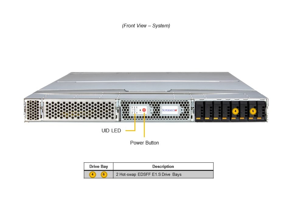 - Default: Total 8 bays8 front fixed E1.S NVMe drive bays