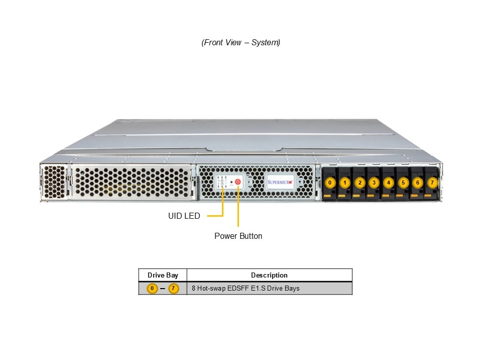 - Up to 8 front hot-swap E1.S NVMe drive baysSupports 8 E1.S Drives as opposed to NHR version which supports 2.