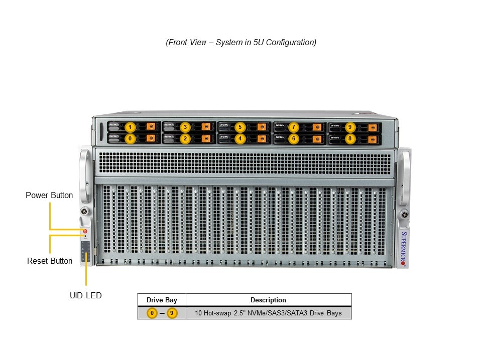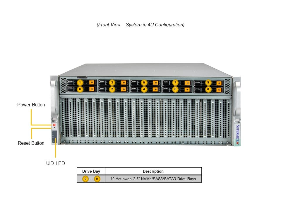 - Default: Total 10 bays10 front hot-swap 2.5″ NVMe/SAS/SATA drive bays