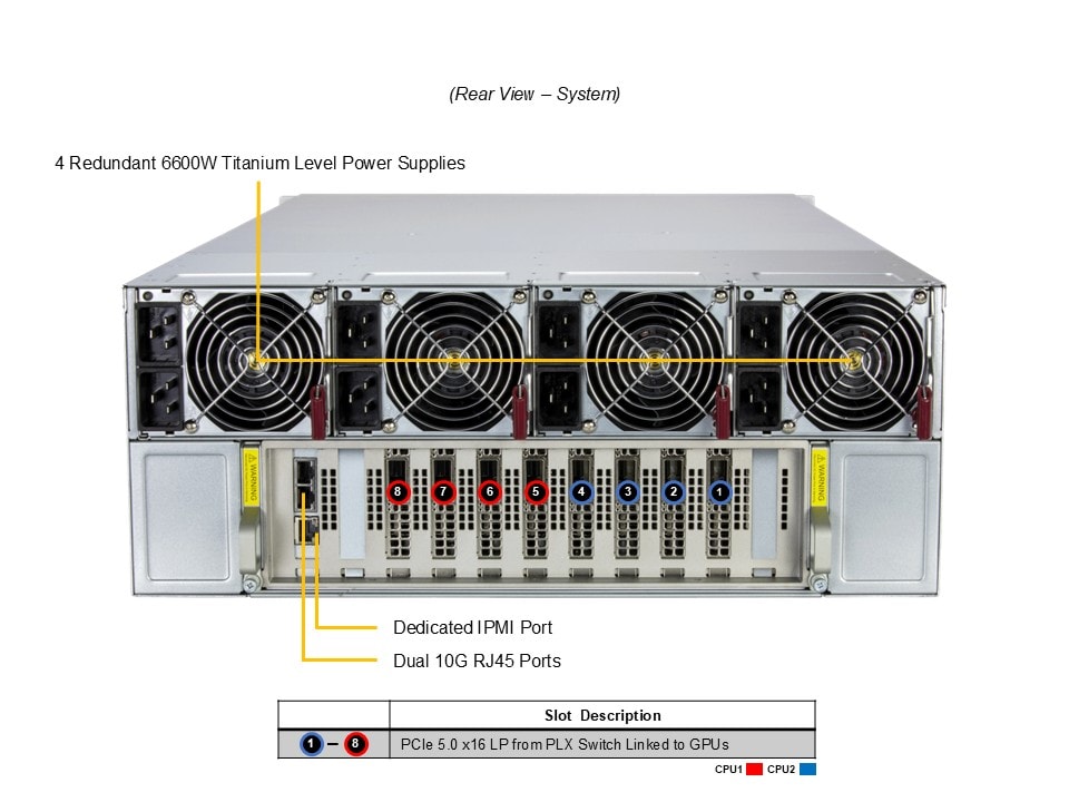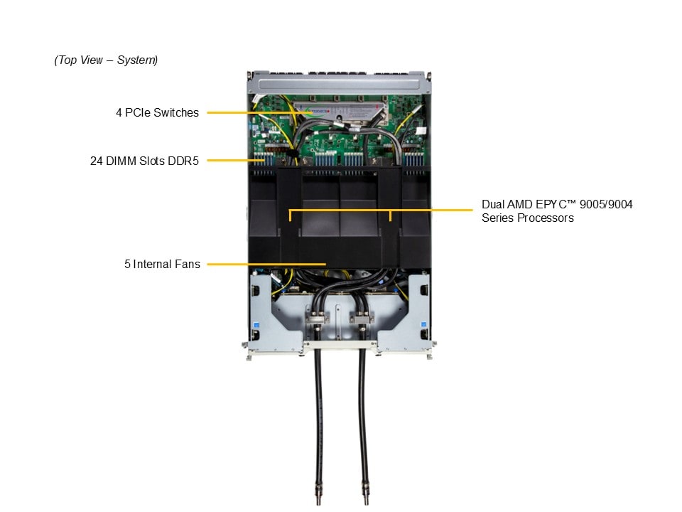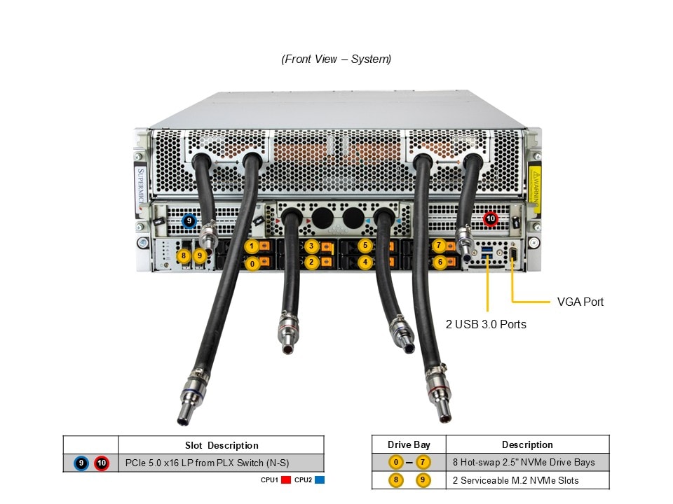- 8 front hot-swap 2.5″ PCIe 5.0 x4 NVMe drive bays