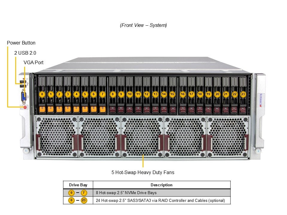 - Option A: Total 16 bays16 front fixed 2.5″ NVMe drive bays