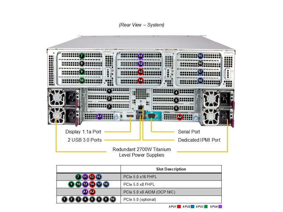 - Option D*4 PCIe 5.0 x16 FHHL slots 2 PCIe 5.0 x8 FHHL slots 2 PCIe 5.0 x8 AIOM slots (OCP 3.0 compatible)