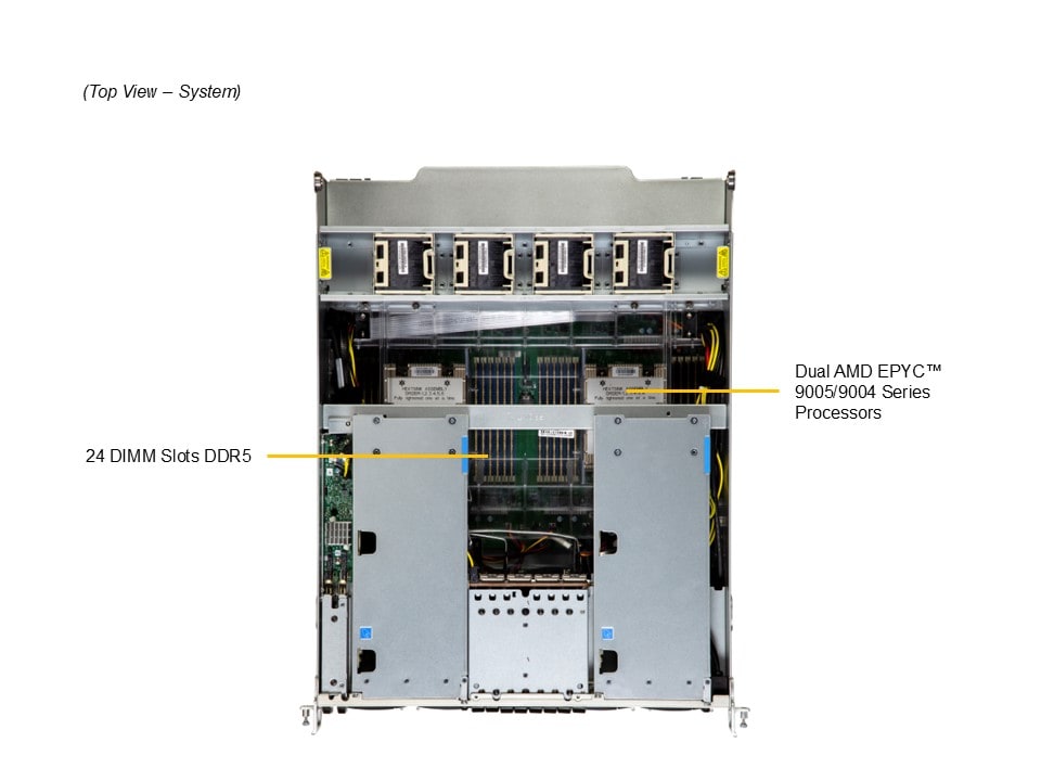 - Dual Socket SP5 AMD EPYC™ 9005/9004 Series Processors up to 500W with air cooling