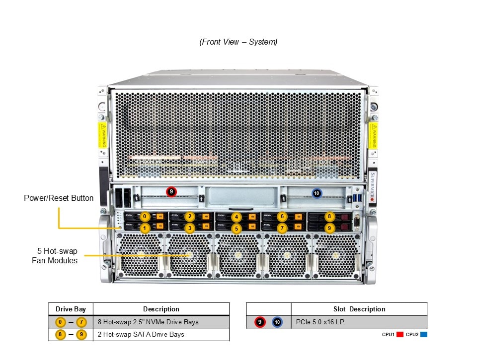 - 8x front hot-swap 2.5″ NVMe + 2 front hot-swap 2.5″ SATA