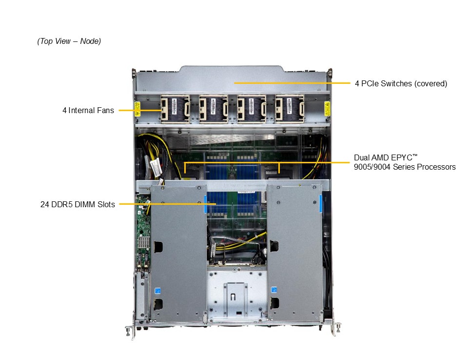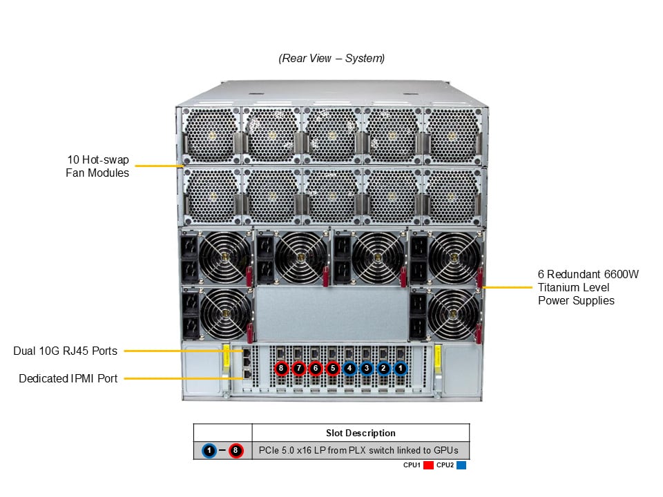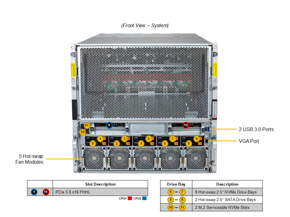 - 8 front hot-swap 2.5″ PCIe 5.0 x4 NVMe drive bays