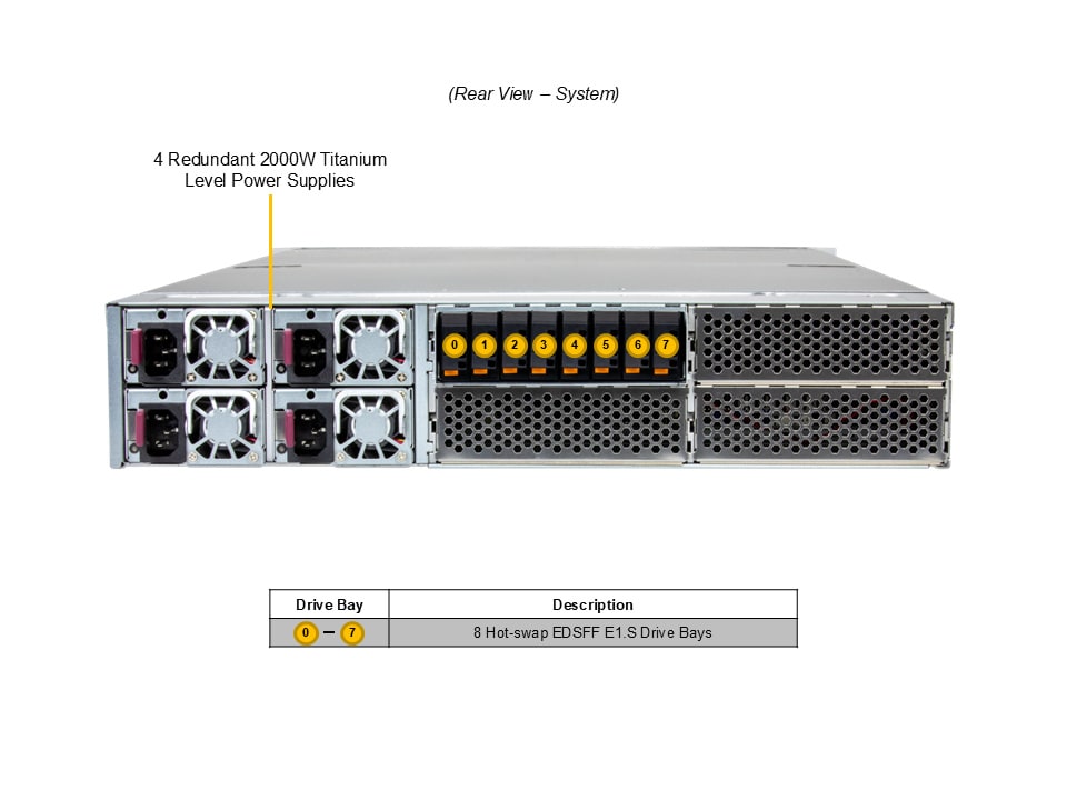 - Default: Total 8 bays8 front hot-swap E1.S NVMe drive bays