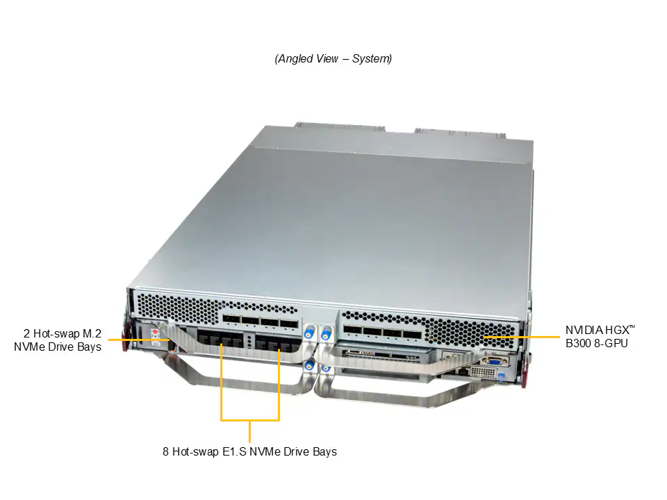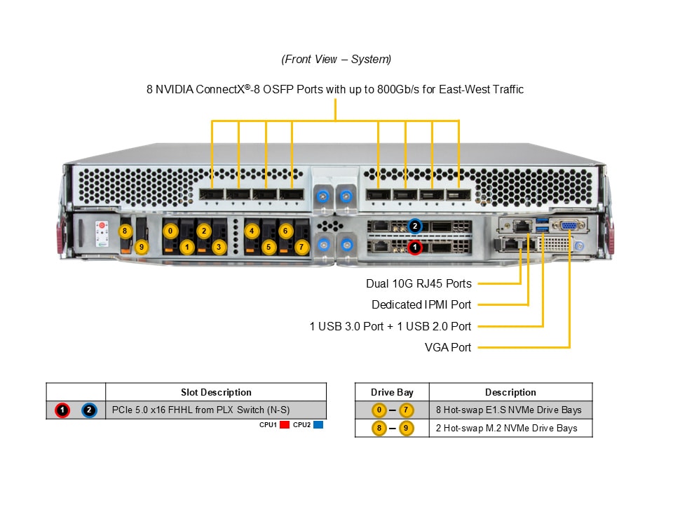 - 8x Hot-swap E1.S NVMe storage drive bays and 2x M.2 NVMe boot drives