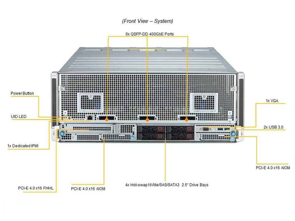 - 4 front hot-swap 2.5″ NVMe/SAS/SATA drive bays