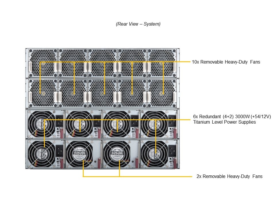 - 6x 3000W 6x 3000W Redundant Titanium Level (96%) power supplies Dimension (WxHxL)106.5 x 82.4 x 203.5 mm Input2880W: 200-207Vac 2880W: 200-207Vac / 50-60Hz 3000W: 207.1-240Vac 3000W: 240Vdc 3000W: 207.1-240Vac / 50-60Hz 3000W: 240Vdc / 50-60Hz +12VMax: 91.66A / Min: 0A (Vdc-240Vdc)Max: 91.66A / Min: 0A (200Vac-240Vac) 12V SBMax: 4A / Min: 0A Output TypeBackplanes (gold finger)