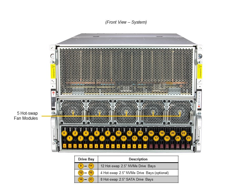- Default: Total 20 bays12 front hot-swap 2.5″ NVMe drive bays 8 front hot-swap 2.5″ SATA drive bays