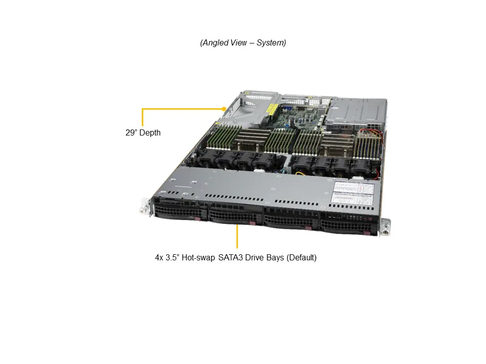 - 4 hot-swap 3.5″ SATA3 by defaultor 4 NVMe (via optional drive tray)or 4 SAS3 (via optional SAS kit)