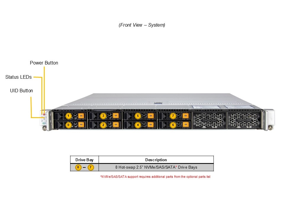 • (*NVMe/SAS/SATA support may require additional storage controller and/or cables, please see the optional parts list for details)
