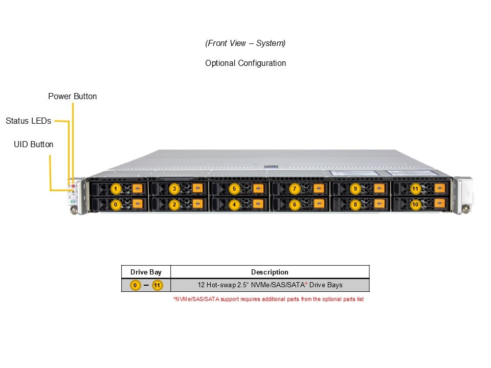 • Option A: Total 12 bays12 front hot-swap 2.5″ PCIe 5.0 NVMe*/SAS*/SATA* drive bays