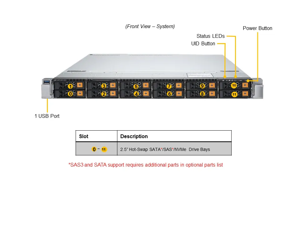 10. 12 Hot-swap 2.5″ NVMe drive baysor SATA3/SAS3 (via optional SAS kit)