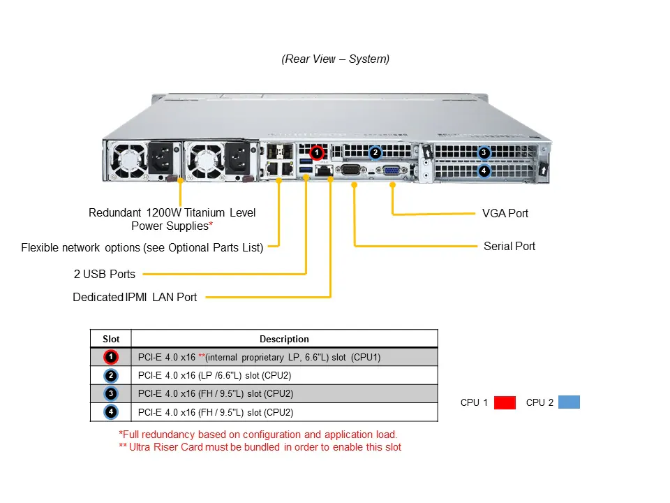 5. Must bundle with optional Ultra Riser Card2 PCIe 4.0 x16 FH, 9.5″L1 PCIe 4.0 x16 LP1 PCIe 4.0 x16 (internal proprietary LP slot), Ultra Riser Card must be bundled in order to enable this slot