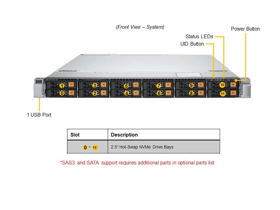 10. 12 Hot-swap 2.5″ NVMe drive baysor SATA3/SAS3 (via optional SAS kit)