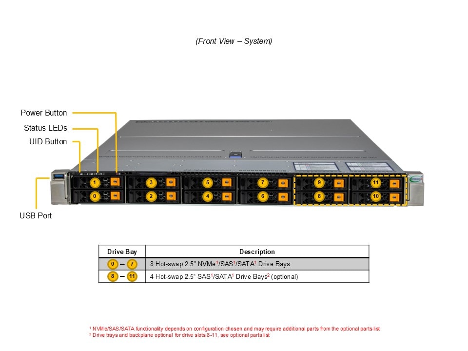 - 8 Hot-swap 2.5″ NVMe/SATA/SAS drive baysOptional 4 Hot-swap 2.5″ NVMe/SAS/SATA drive support via additional parts2 M.2 PCIe 3.0 NVMe slots