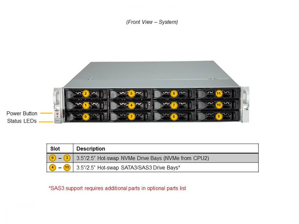 - Option A: Total 12 bays12 front hot-swap 2.5″ SAS/SATA drive bays