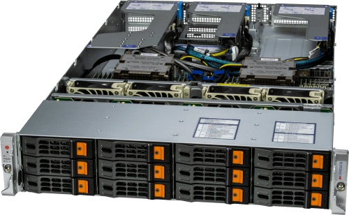 - 12 front hot-swap 3.5″/2.5″ NVMe*/SAS*/SATA* drive bays