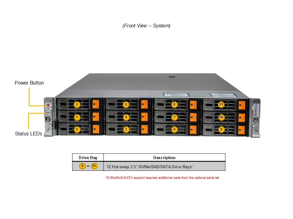 - Default: Total 12 bays12 front hot-swap 3.5″/2.5″ NVMe*/SAS*/SATA* drive bays