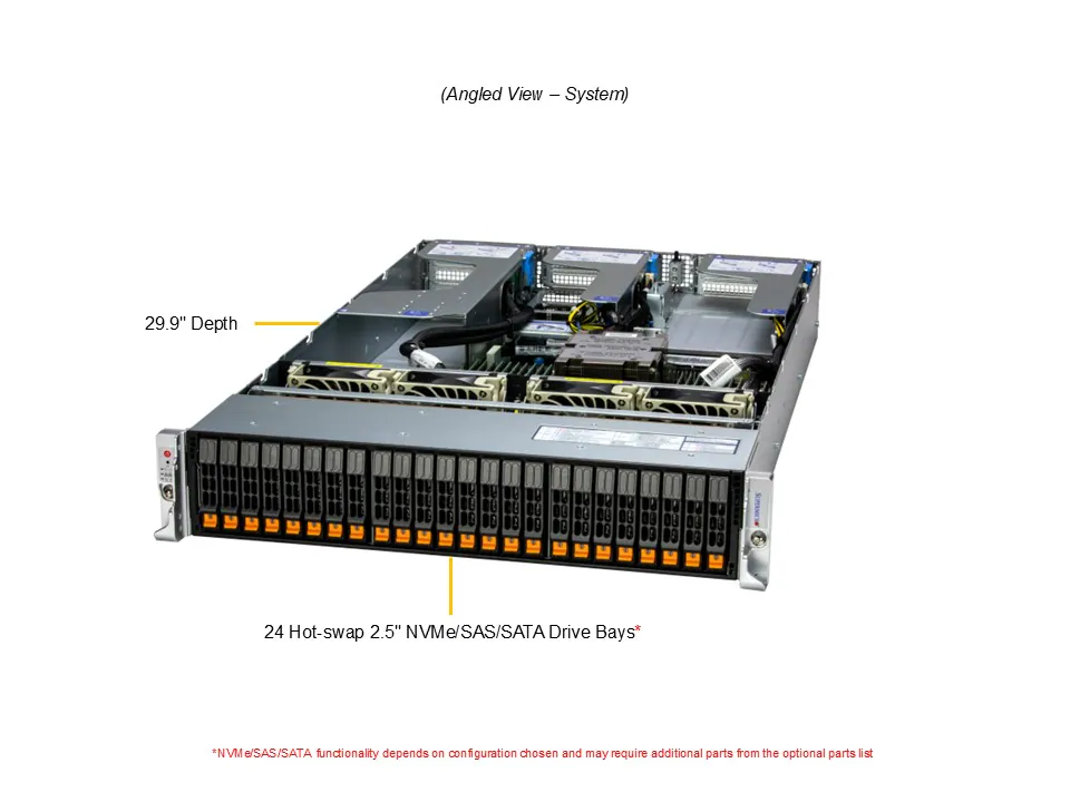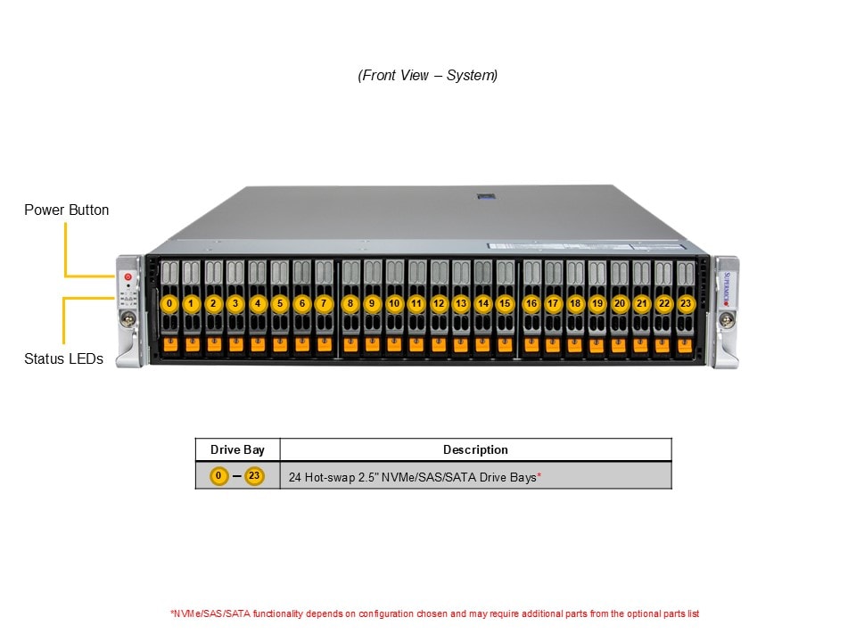- Default: Total 24 bays24 front hot-swap 2.5″ NVMe*/SAS*/SATA* drive bays