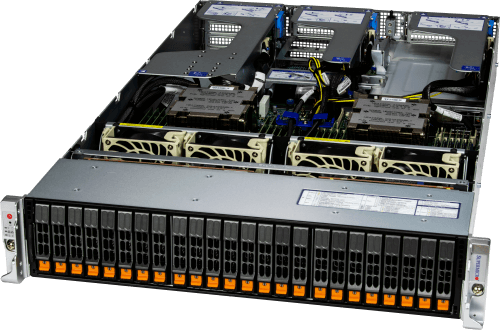 - 24 front hot-swap 2.5″ NVMe*/SAS*/SATA* drive bays