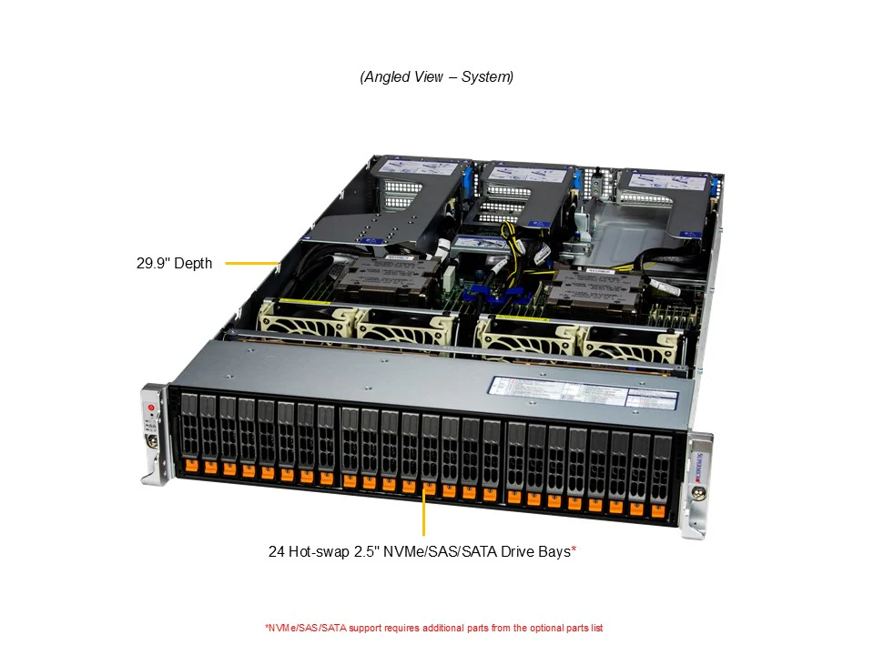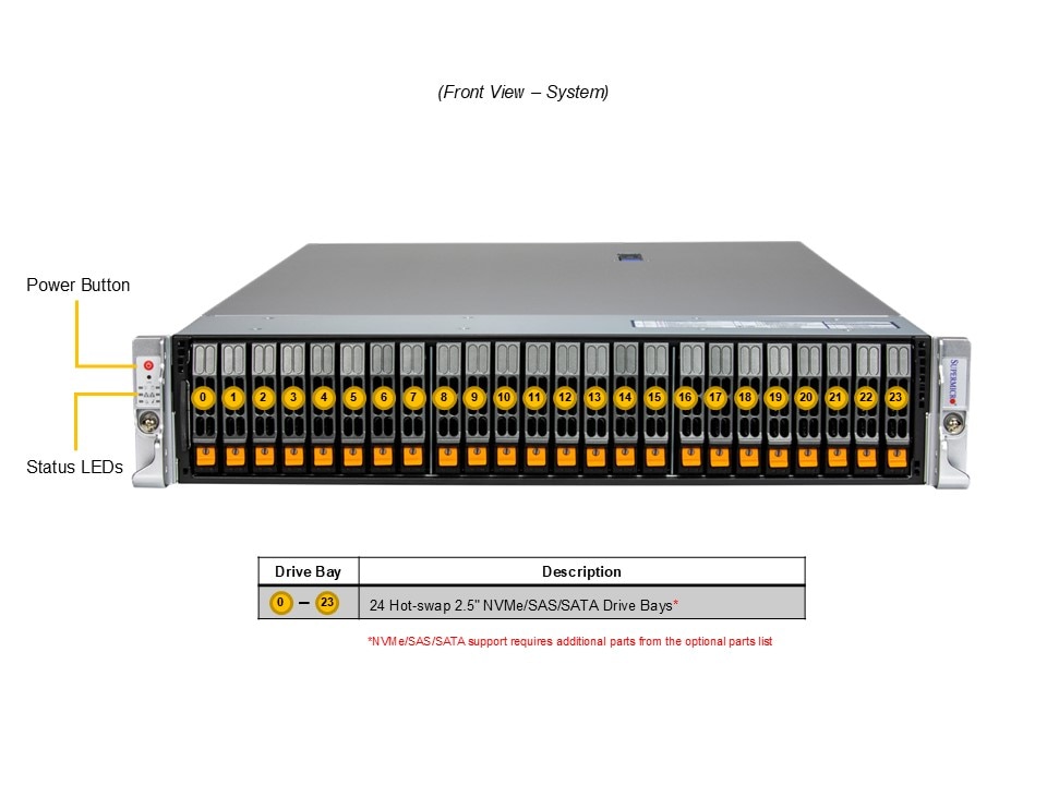 - Default: Total 24 bays24 front hot-swap 2.5″ NVMe*/SAS*/SATA* drive bays