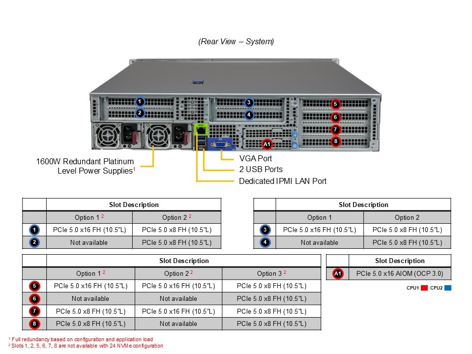 - Option B*2 PCIe 5.0 x8 (in x16) FHFL slots 1 PCIe 5.0 x16 AIOM slot (OCP 3.0 compatible)