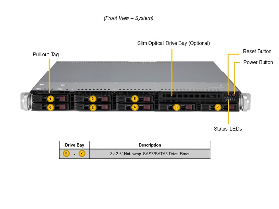 • Default: Total 8 bays8 front hot-swap 2.5″ SATA drive bays