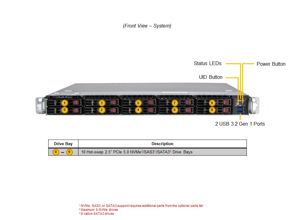 - Option A: Total 10 bays2 front hot-swap 2.5″ PCIe 5.0 x4 NVMe* drive bays 8 front hot-swap 2.5″ SAS*/SATA drive bays