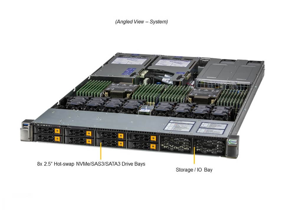 - Default: Total 8 bays8 front hot-swap 2.5″ NVMe*/SAS*/SATA* drive bays