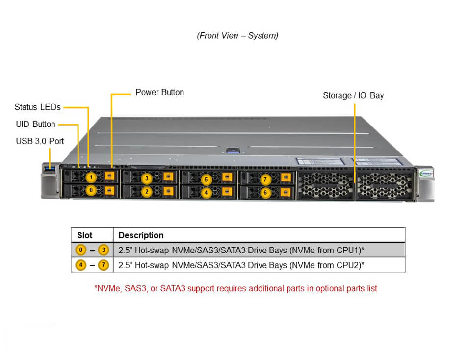 - (*NVMe/SAS/SATA support may require additional storage controller and/or cables, please see the optional parts list for details)
