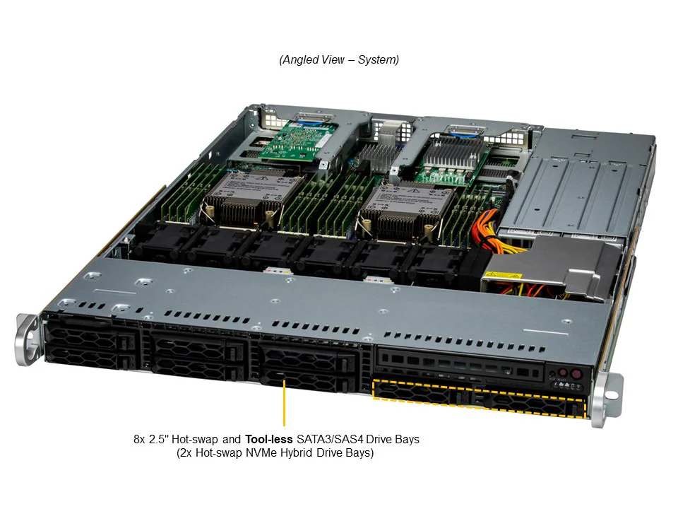 - 2 front hot-swap 2.5″ NVMe*/SAS*/SATA* drive bays