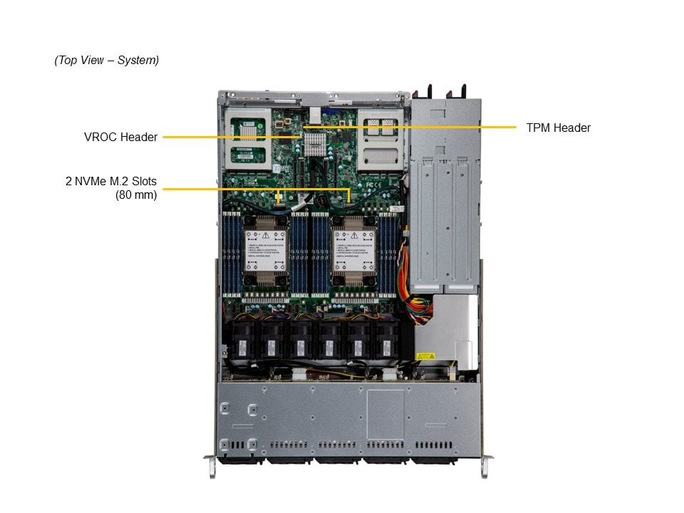 - 2 M.2 PCIe 5.0 x4 NVMe slots (M-key 2280(default); VROC required for RAID)