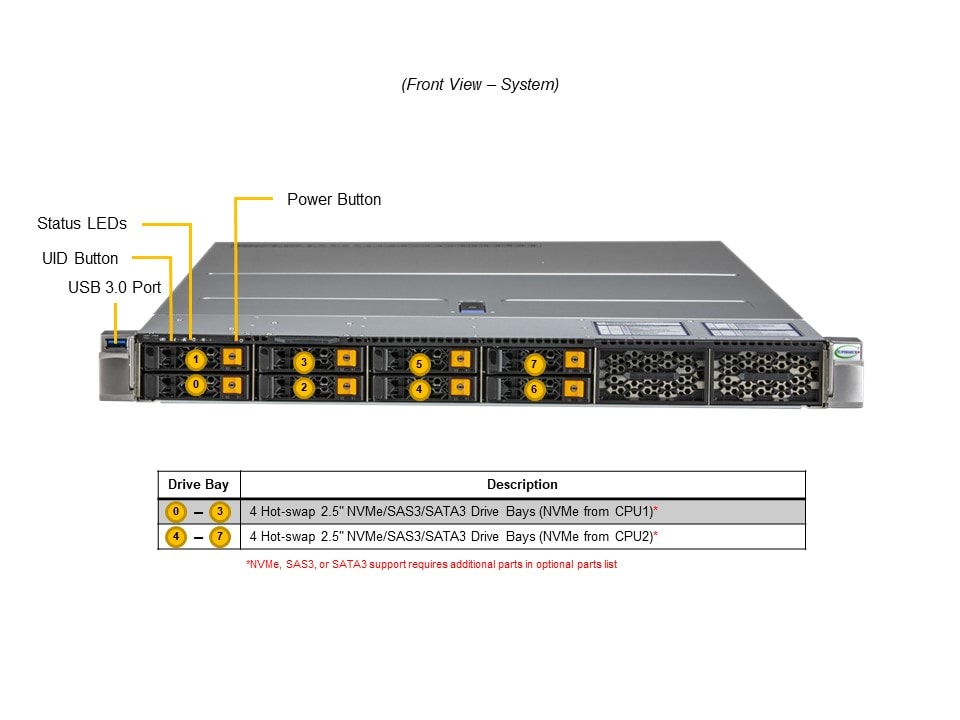 - (*NVMe/SAS/SATA support may require additional storage controller and/or cables, please see the optional parts list for details)