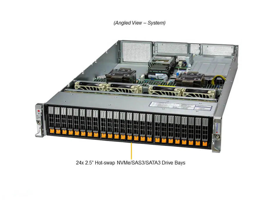 - 24 front hot-swap 2.5″ NVMe*/SAS*/SATA* drive bays