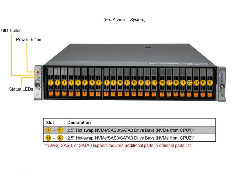 - Default: Total 24 bays24 front hot-swap 2.5″ NVMe*/SAS*/SATA* drive bays