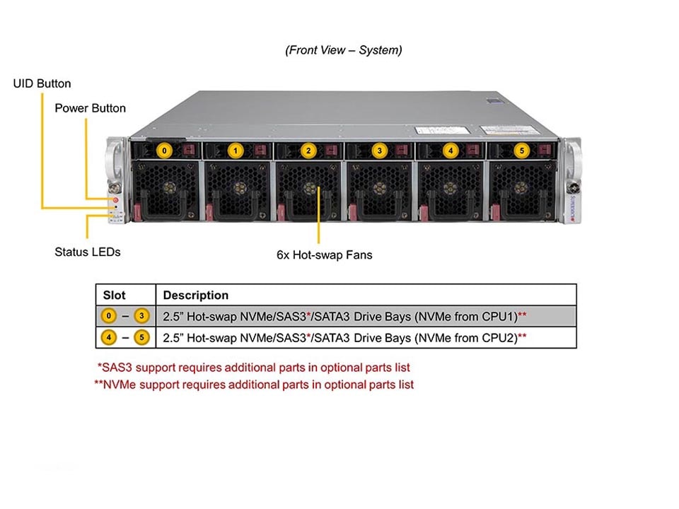 - 6 front hot-swap 2.5″ NVMe/SAS*/SATA drive bays