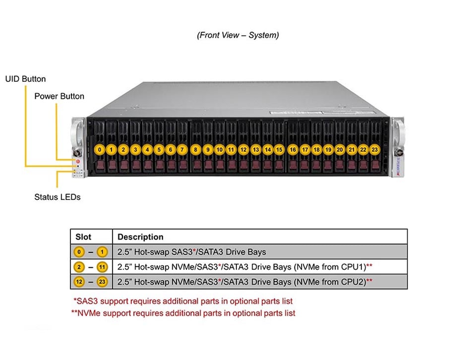 - Default: Total 24 bays22 front hot-swap 2.5″ NVMe/SAS*/SATA drive bays 2 front hot-swap 2.5″ SAS*/SATA drive bays