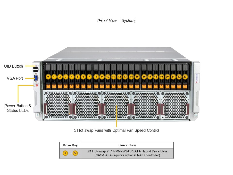 • Default: Total 24 bays24 front hot-swap 2.5″ PCIe 5.0 NVMe*/SAS*/SATA* drive bays