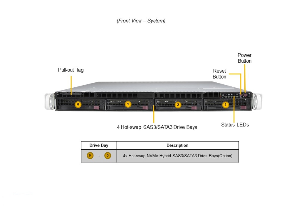 • Default: Total 4 bays4 front hot-swap 3.5″ PCIe 4.0 NVMe*/SAS*/SATA drive bays