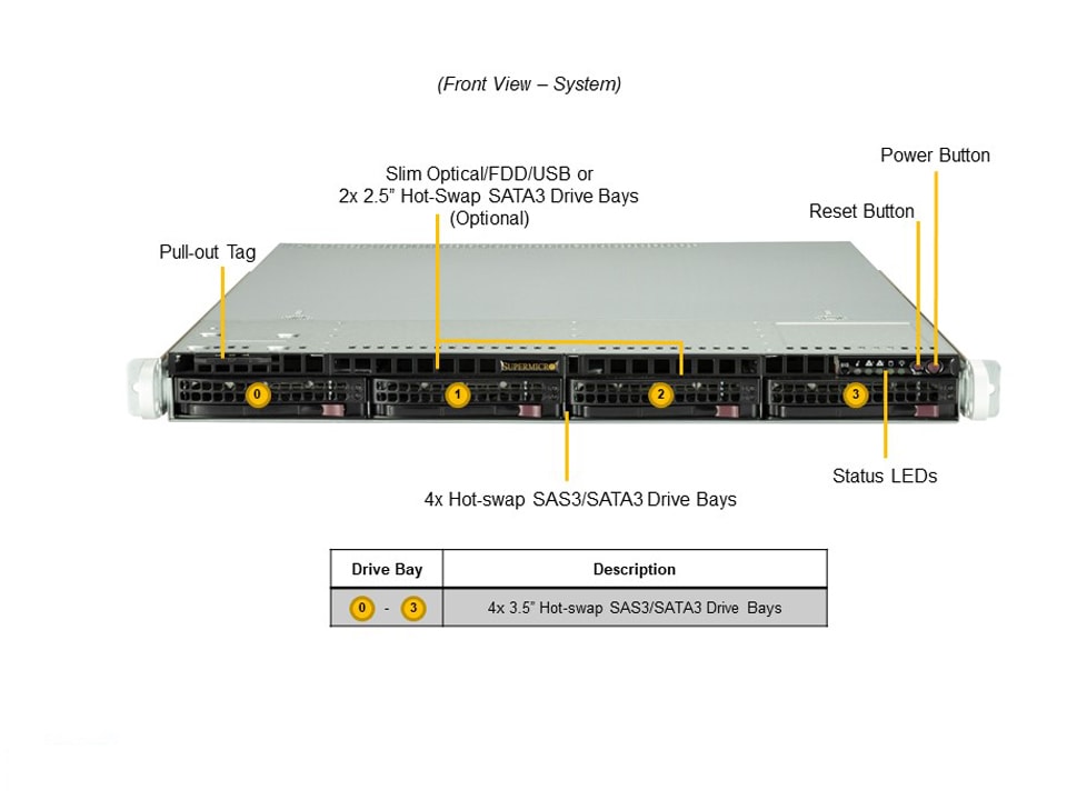 - Default: Total 4 bays4 front hot-swap 3.5″ SAS*/SATA drive bays