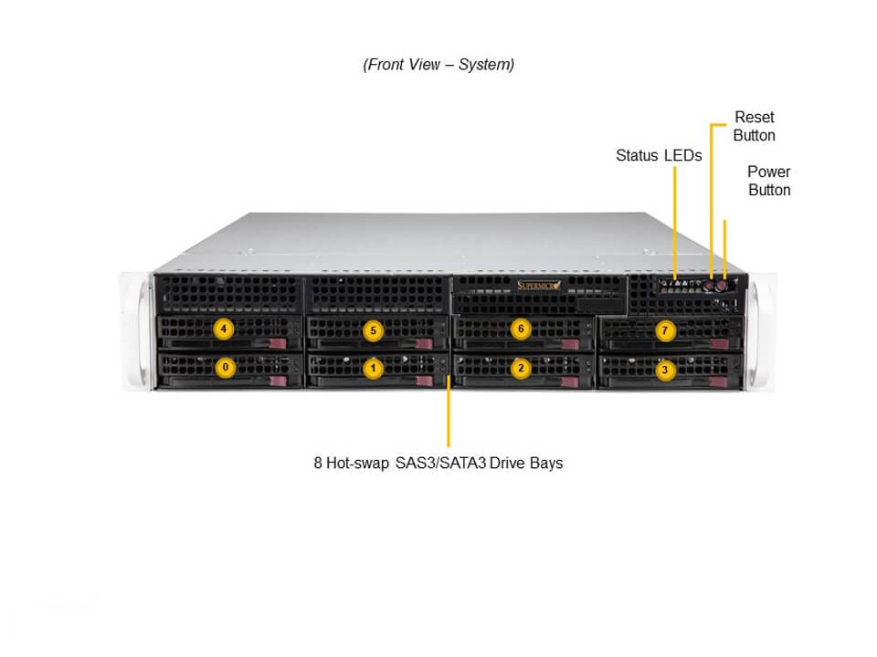 - Default: Total 8 bays8 front hot-swap 3.5″ SAS*/SATA drive bays