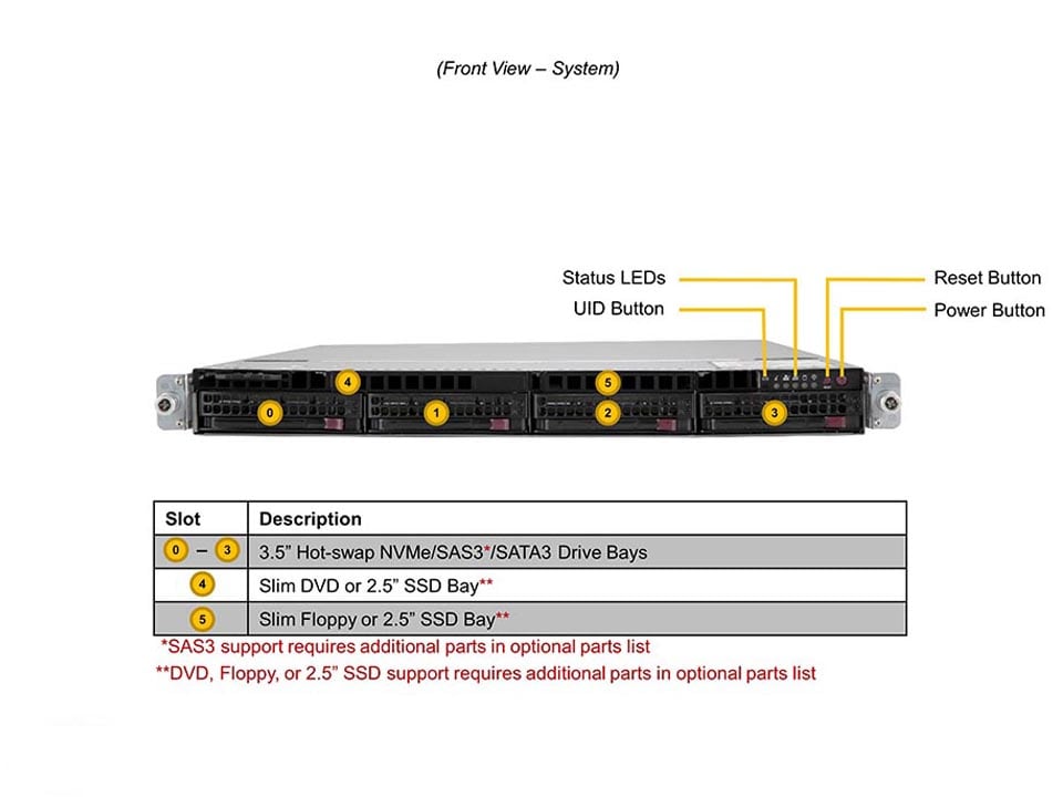 - Default: Total 4 bays4 front hot-swap 2.5″ NVMe*/SAS*/SATA drive bays