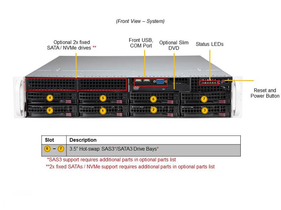 • Default: Total 8 bays8 front hot-swap 3.5″ SAS*/SATA drive bays